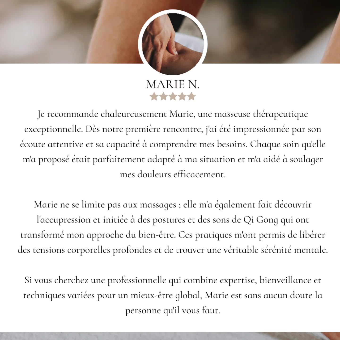 Je vous propose une parenthèse de douceur à travers un massage relaxant sur-mesure, inspiré de la Médecine Traditionnelle Chinoise et du Qigong Tuina.